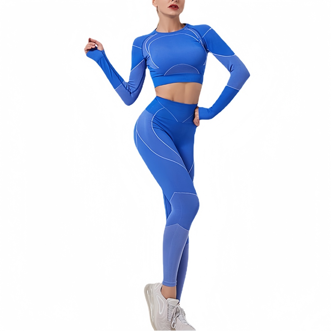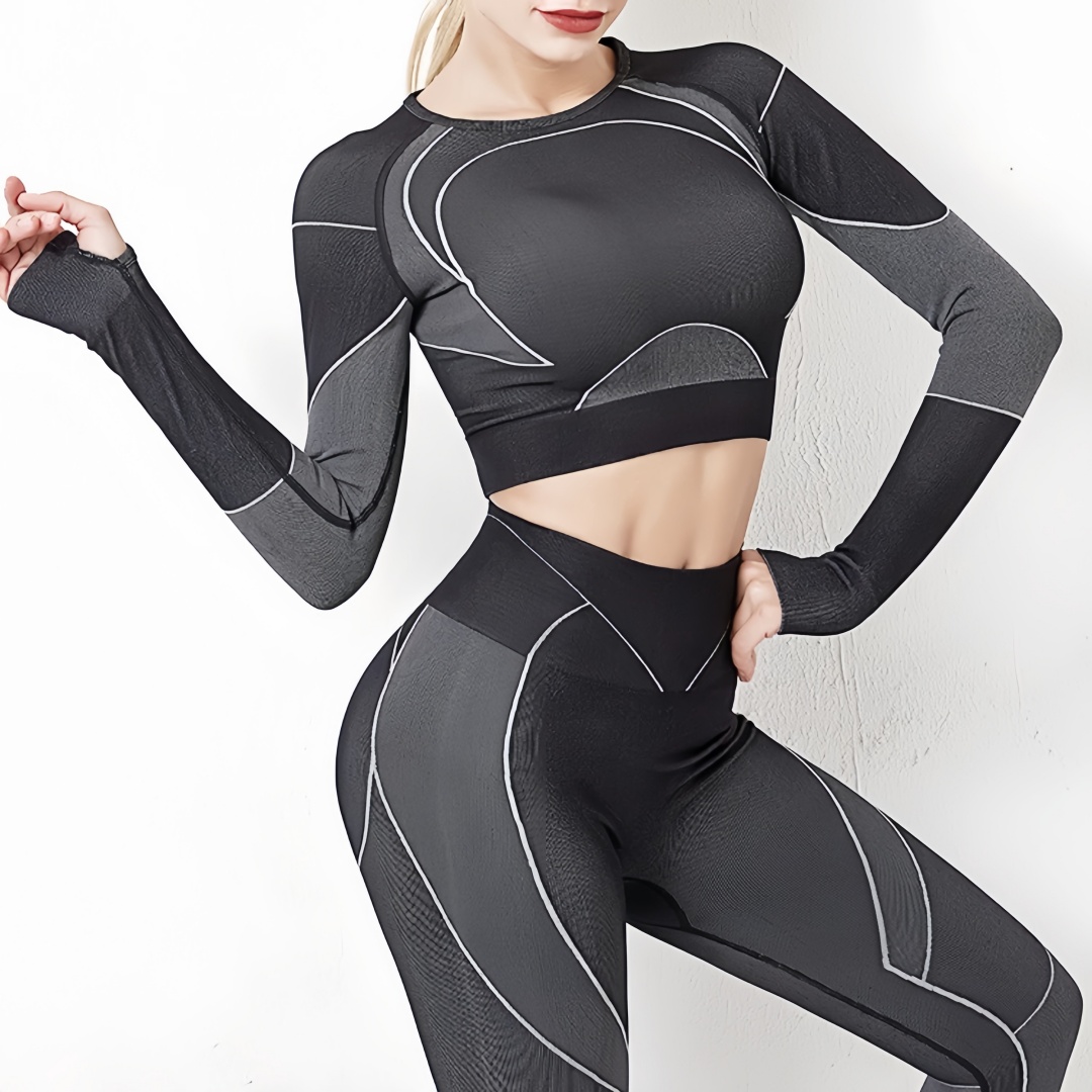 Seamless High Waist Leggings and Crop Top Set – Striped Long Sleeve Yoga Activewear Suit